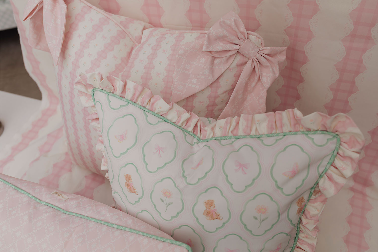 Cojín elaborado con una mezcla de drill suave al tacto, resistente y flexible (80 % poliéster, 15 % algodón, 5 % spandex). Impreso con nuestros diseños textiles exclusivos y rematado con detalles de guipur de algodón. Perfecto para aportar comodidad y un toque de color a la habitación de tu pequeño.